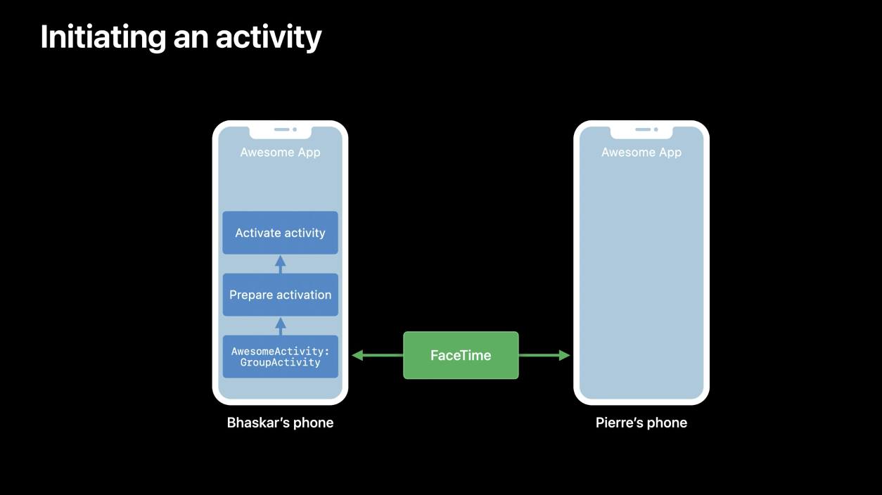このGroupActivity protocolに準拠したオブジェクトには、共有されるActivityの情報を保持しています。 例えば、動画を一緒に視聴する場合は動画のURLを持ちますし、カスタム体験で一緒にお絵描きをする場合は何を描くかについての情報です。